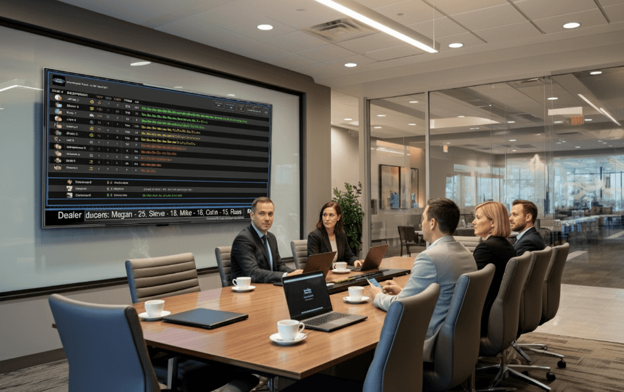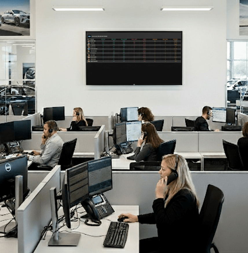 Most dealerships place it in the sales tower, break room, or sales office — anywhere the team gathers and can keep score live. You can even have multiple systems and configure different reports to display in different areas of the dealership, such as a sales manager tower and GM office.
